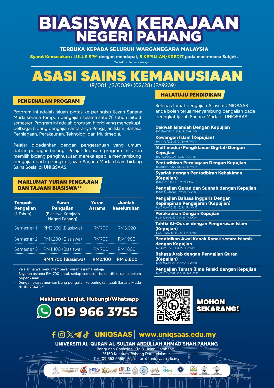 Kini anda berpeluang melanjutkan pengajian ke peringkat Asasi dengan tajaan biasiswa di Universiti Al-Quran Al-Sultan Abdullah Ahmad Shah Pahang (UNIQSAAS )!
