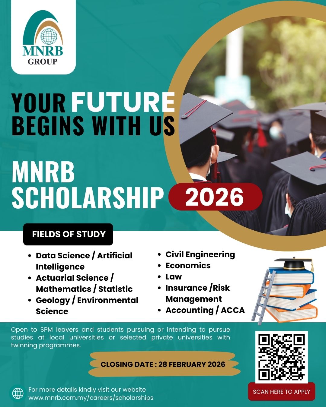 Info lanjut mengenai Biasiswa MNRB, sila layari laman web https://www.mnrb.com.my/careers/scholarships.