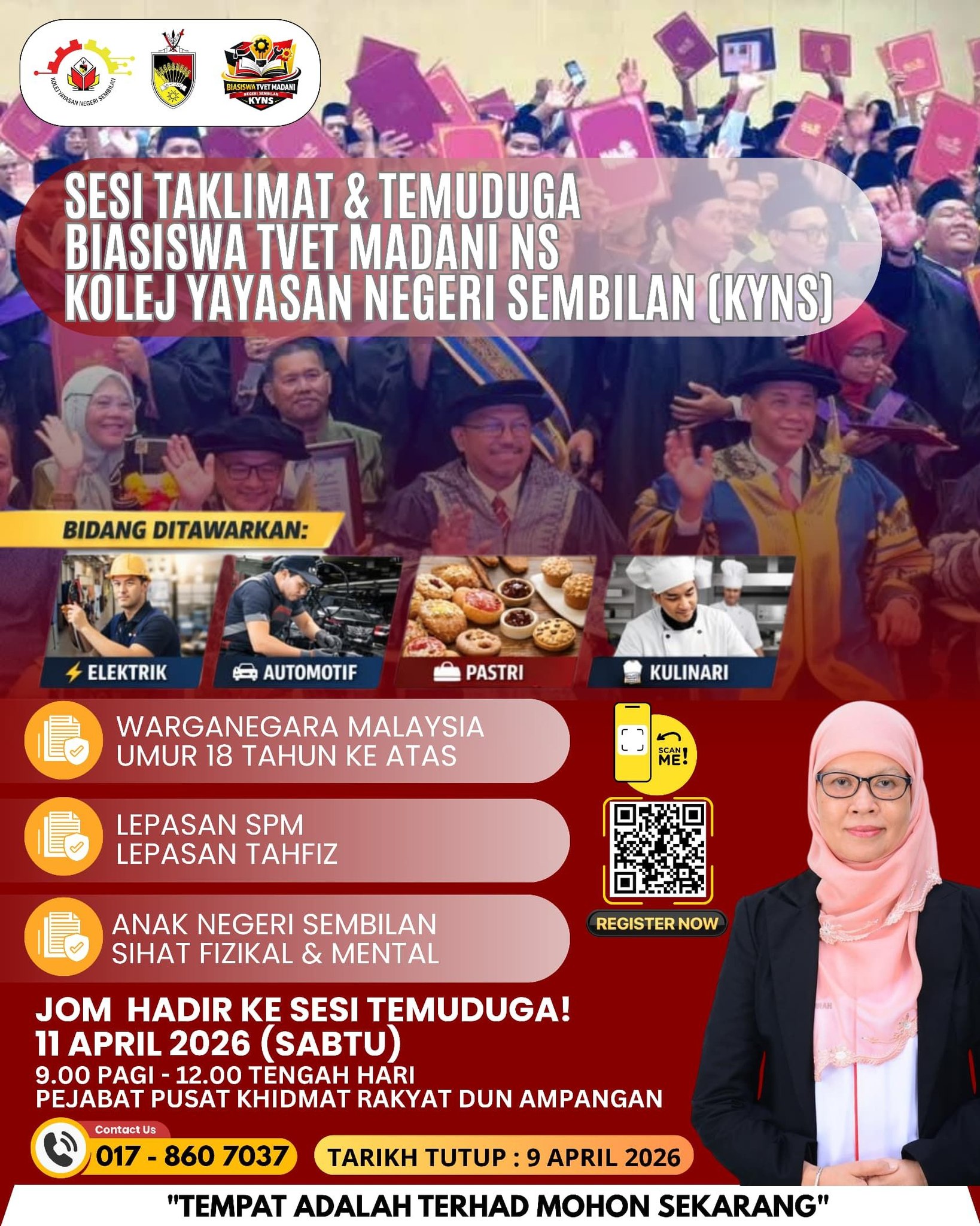 Sukacita dimaklumkan bahawa permohonan Biasiswa TVET Madani Negeri Sembilan kini dibuka kepada anak-anak muda, khususnya lepasan SPM dan Tahfiz yang berminat untuk membina masa depan melalui kemahiran.