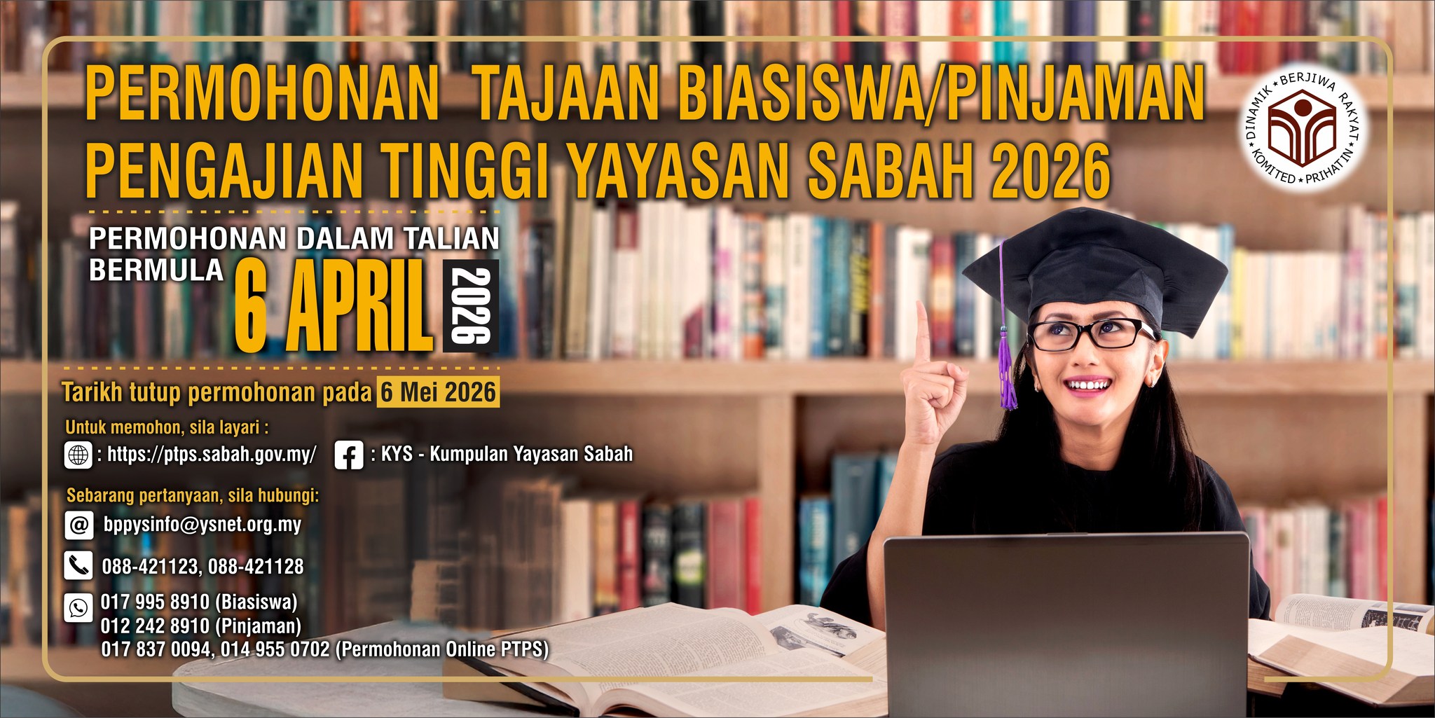 Kumpulan Yayasan Sabah mempelawa pemohon yang berkelayakan untuk memohon tajaan Biasiswa/Dermasiswa/Pinjaman Pengajian Tinggi yang mengikut pengajian di peringkat Sijil, Diploma atau Ijazah Sarjana Muda bagi sesi pengajian 2026.