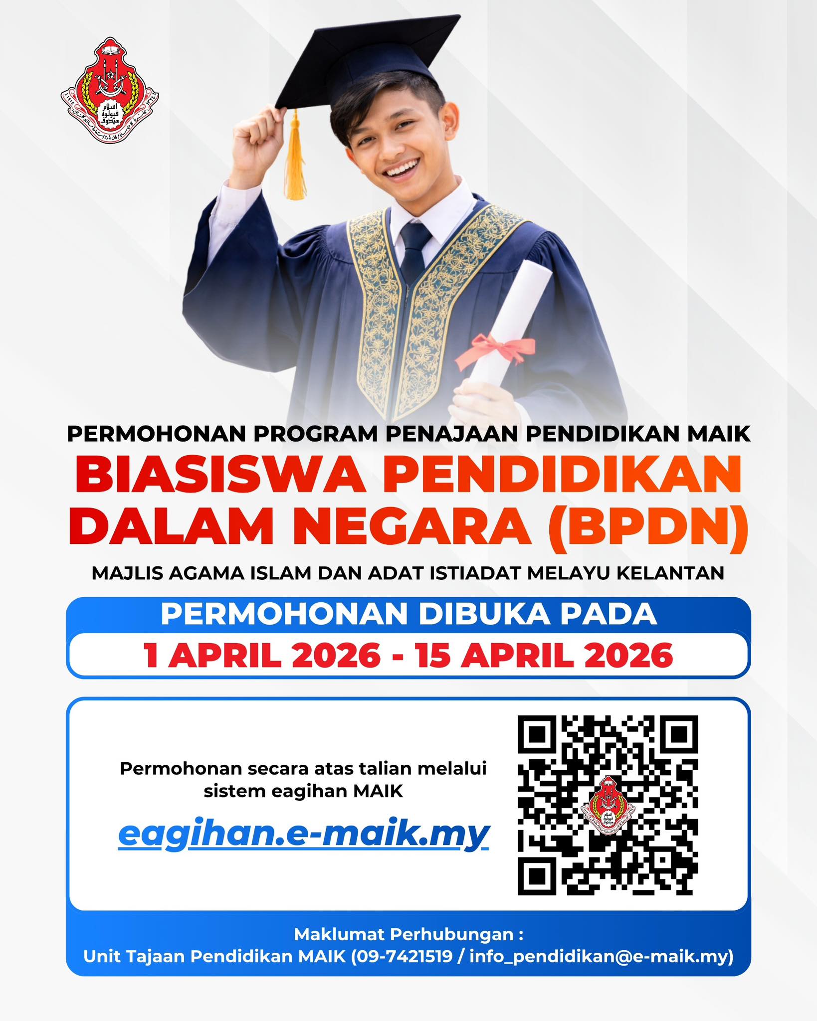 Permohonan bagi Biasiswa Pendidikan Dalam Negara (BPDN) Majlis Agama Islam dan Adat Istiadat Melayu Kelantan (MAIK) kini dibuka bermula 1 April 2026 sehingga 15 April 2026.