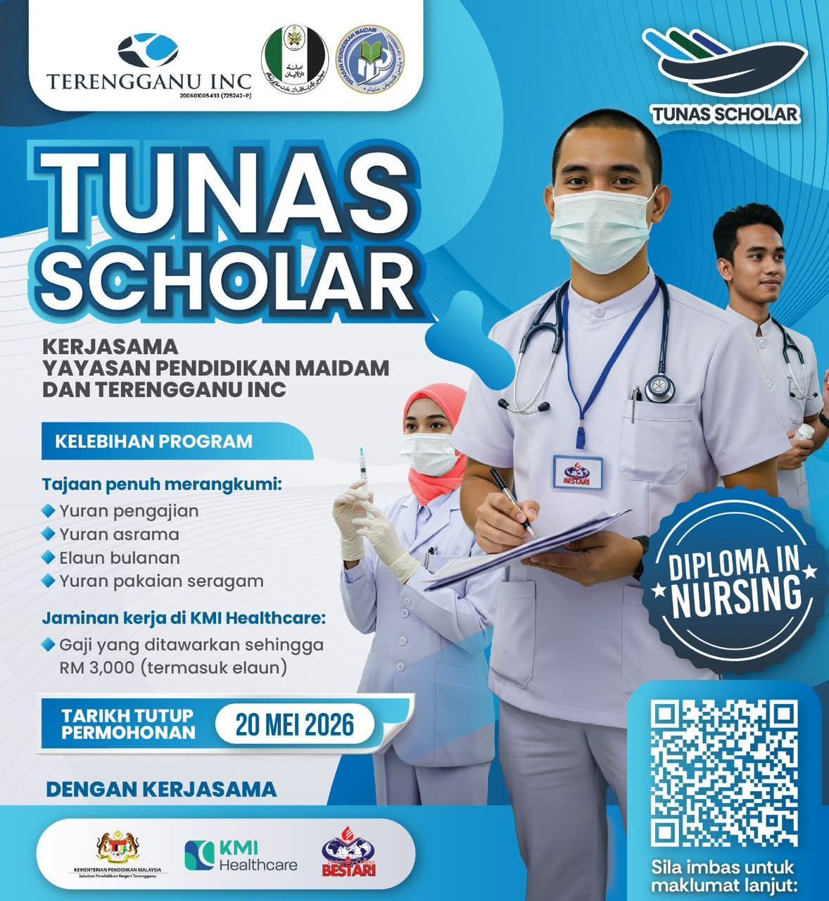 Program TUNAS Scholar kini dibuka dengan peluang tajaan penuh pengajian bagi Diploma Kejururawatan di University College Bestari, hasil kerjasama Yayasan Pendidikan MAIDAM dan Terengganu Inc.